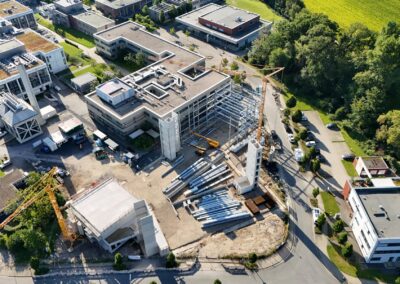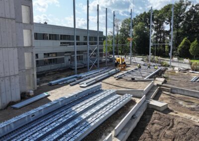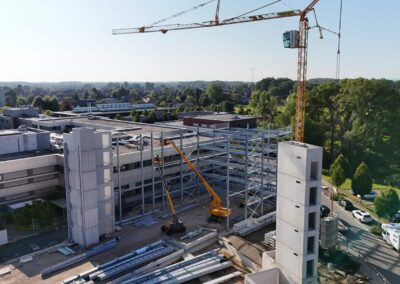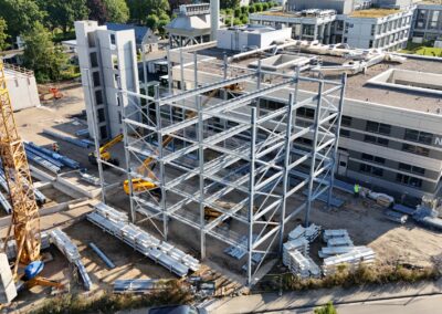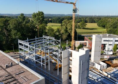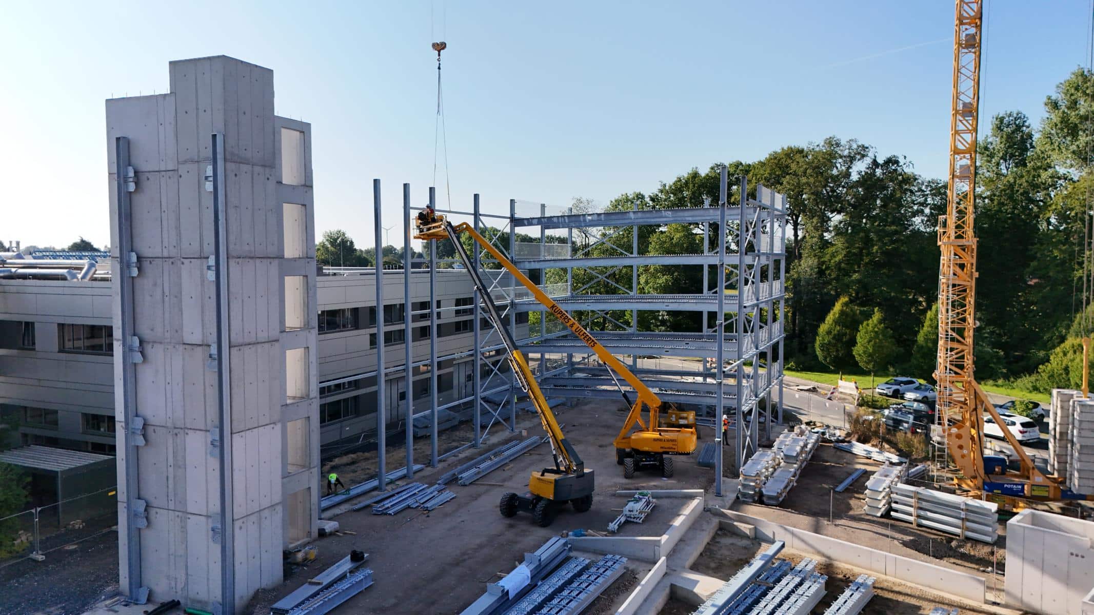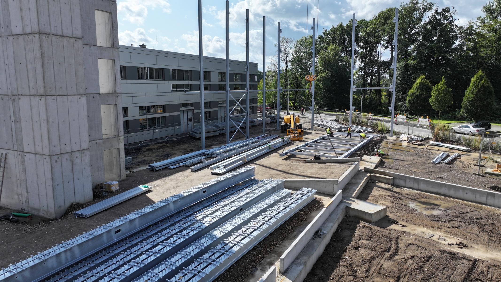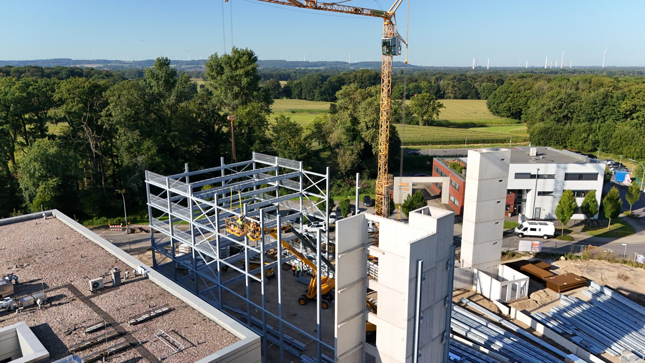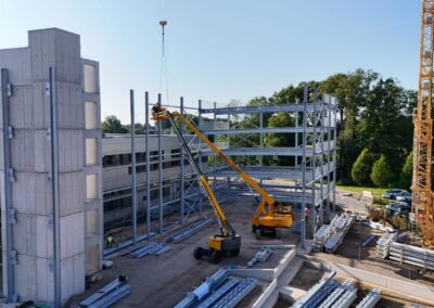 Das Parkhaus am Technologie-Campus Steinfurt sticht mit einer begrünten Fassade und einer vollflächigen Photovoltaikanlage über dem obersten Parkdeck, sowie an der Südfassade heraus. Der RSB realisiert bei diesem Projekt nicht nur den schweren Stahlbau, der die Tragkonstruktion darstellt, sondern auch die Absturzsicherung und das Hoesch- Additiv Deckensystem. Die modulare Absturzsicherung erfolgt über die Systemlösung Integra-pw. Das Hoesch- Additiv Deckensystem stellt die verlorene Schalung für die vor Ort betonierte Deckenplatte, die mit den Stahlverbundträgern als Stahlbetonverbundrippendecke ausgeführt wird, dar. Die Montage der Stahltragkonstruktion und der Absturzsicherung erfolgt zeitgleich, anschließend werden die Hoesch-Additiv- Bleche verlegt. Das gesamte Bauvorhaben ist in sechs Bauabschnitte unterteilt. Die ersten fünf Bauabschnitte werden in 10 Wochen montiert. Der sechste Bauabschnitt, welcher die Photovoltaik- Unterkonstruktion beinhalten, wird nach einer Montageunterbrechung zum Ende des Jahres 2024 montiert.