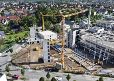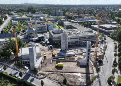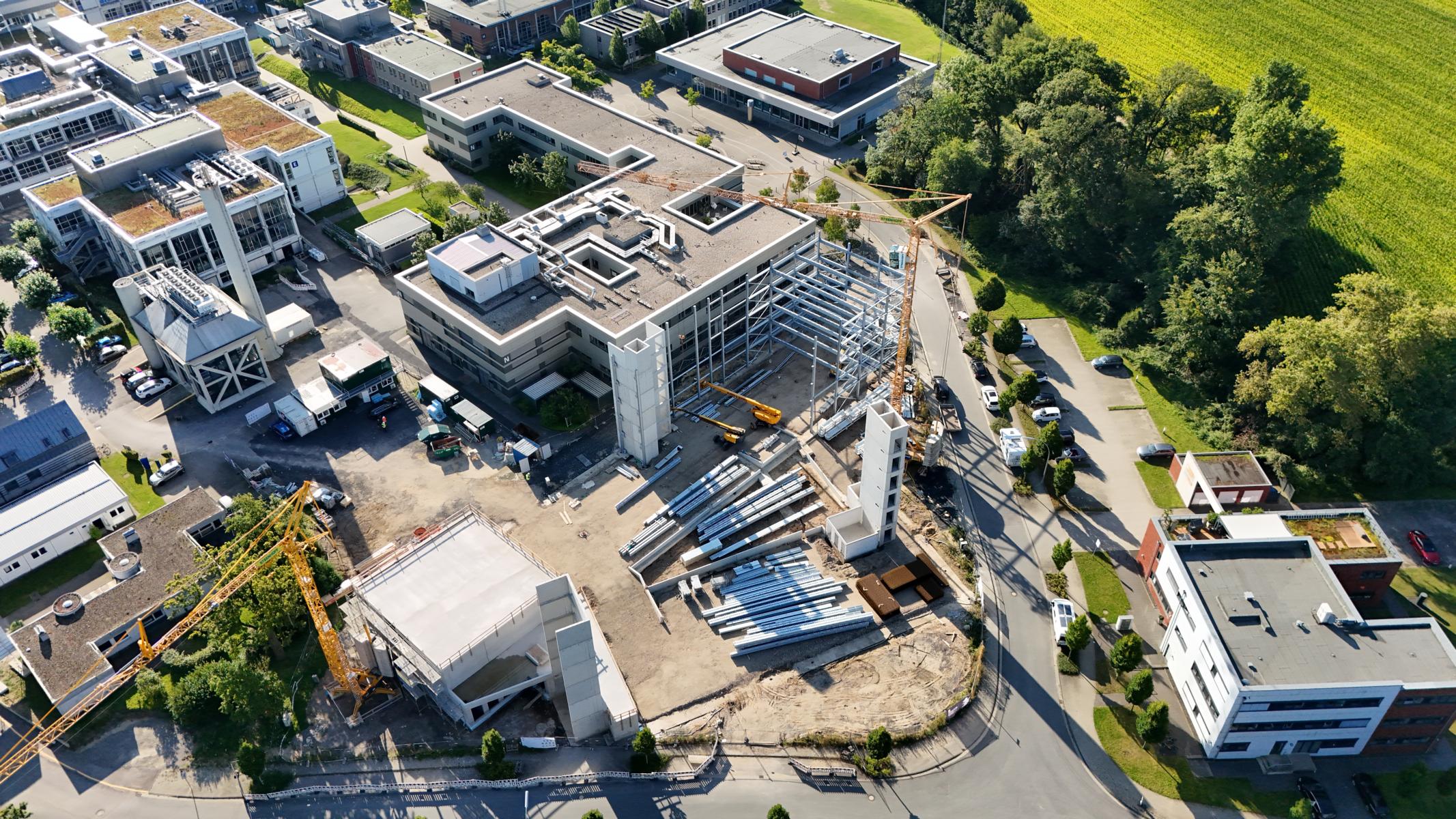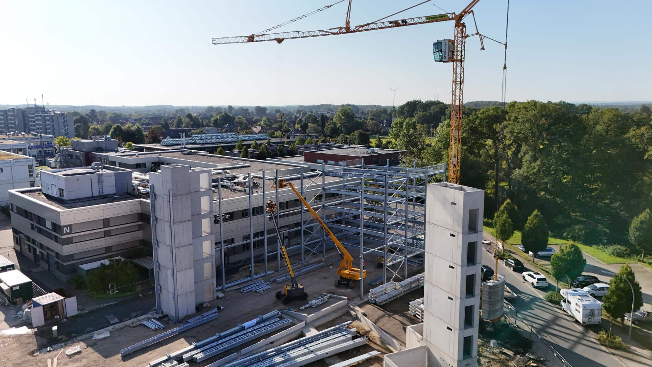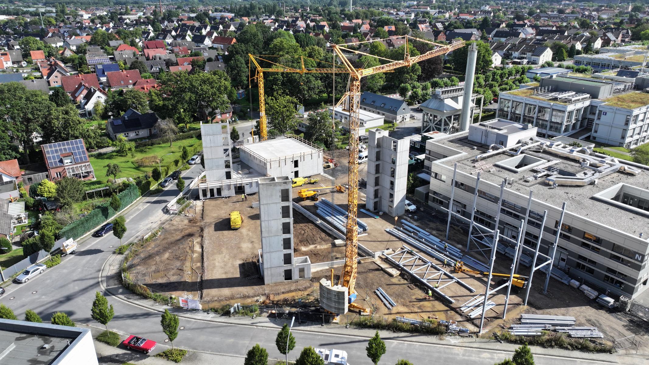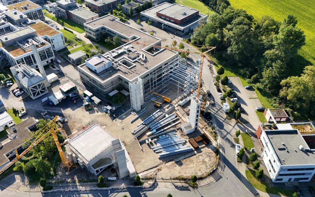 Das Parkhaus am Technologie-Campus Steinfurt sticht mit einer begrünten Fassade und einer vollflächigen Photovoltaikanlage über dem obersten Parkdeck, sowie an der Südfassade heraus. Der RSB realisiert bei diesem Projekt nicht nur den schweren Stahlbau, der die Tragkonstruktion darstellt, sondern auch die Absturzsicherung und das Hoesch- Additiv Deckensystem. Die modulare Absturzsicherung erfolgt über die Systemlösung Integra-pw. Das Hoesch- Additiv Deckensystem stellt die verlorene Schalung für die vor Ort betonierte Deckenplatte, die mit den Stahlverbundträgern als Stahlbetonverbundrippendecke ausgeführt wird, dar. Die Montage der Stahltragkonstruktion und der Absturzsicherung erfolgt zeitgleich, anschließend werden die Hoesch-Additiv- Bleche verlegt. Das gesamte Bauvorhaben ist in sechs Bauabschnitte unterteilt. Die ersten fünf Bauabschnitte werden in 10 Wochen montiert. Der sechste Bauabschnitt, welcher die Photovoltaik- Unterkonstruktion beinhalten, wird nach einer Montageunterbrechung zum Ende des Jahres 2024 montiert.